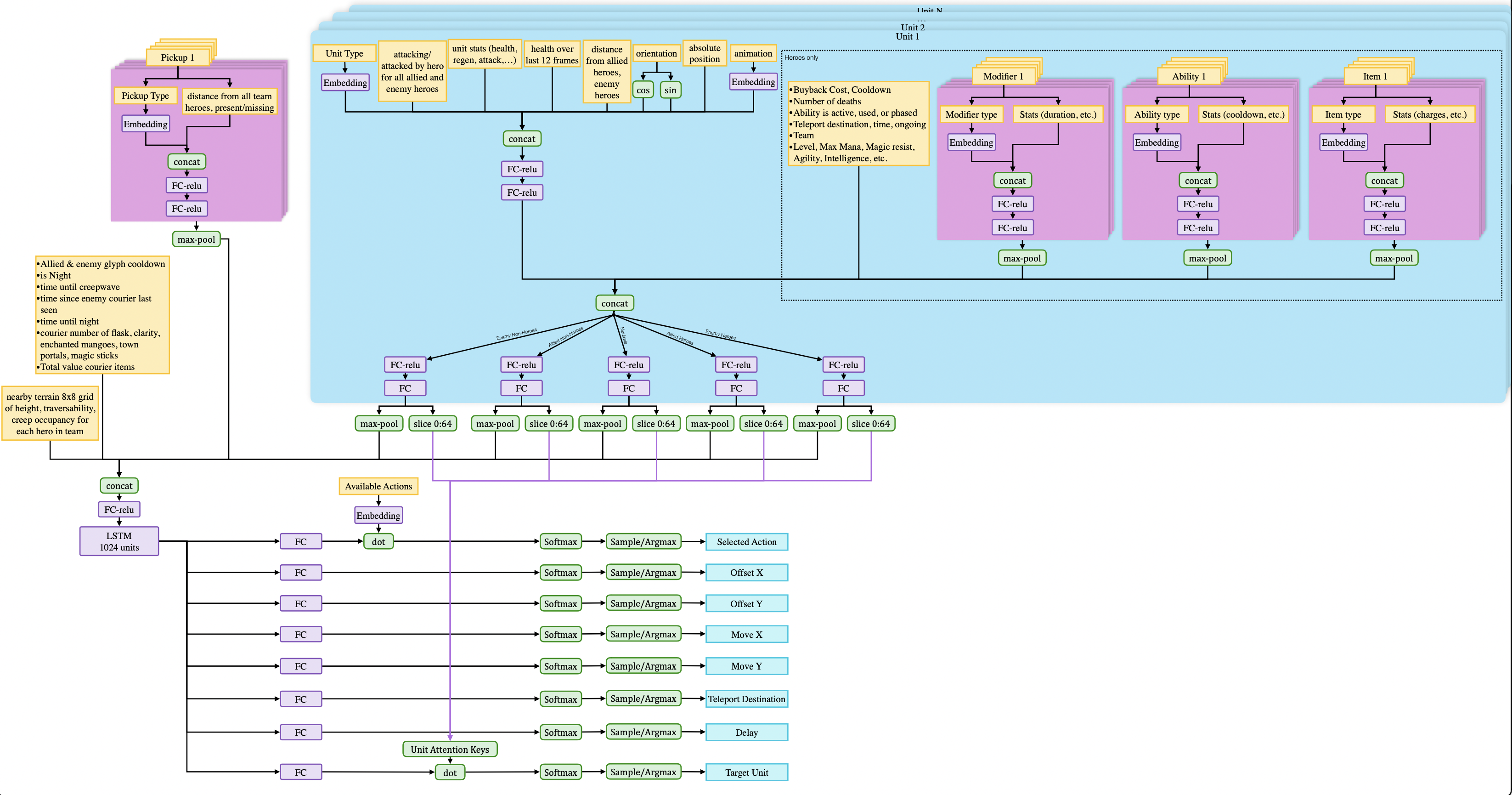 Above we can see the architecture of OpenAI Five, the architecture of the system which beat the world champions at Dota 2 in 2019. The section in blue is dedicated purely to processing each of the individual units in the game and directly integrates complex spatial-visual information, along with semantic information per each unit. Grok 5 will have to learn to process similar visual information for League of Legends.